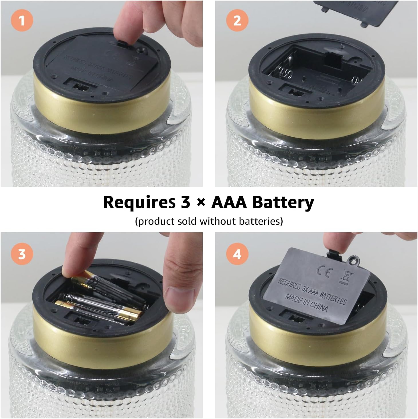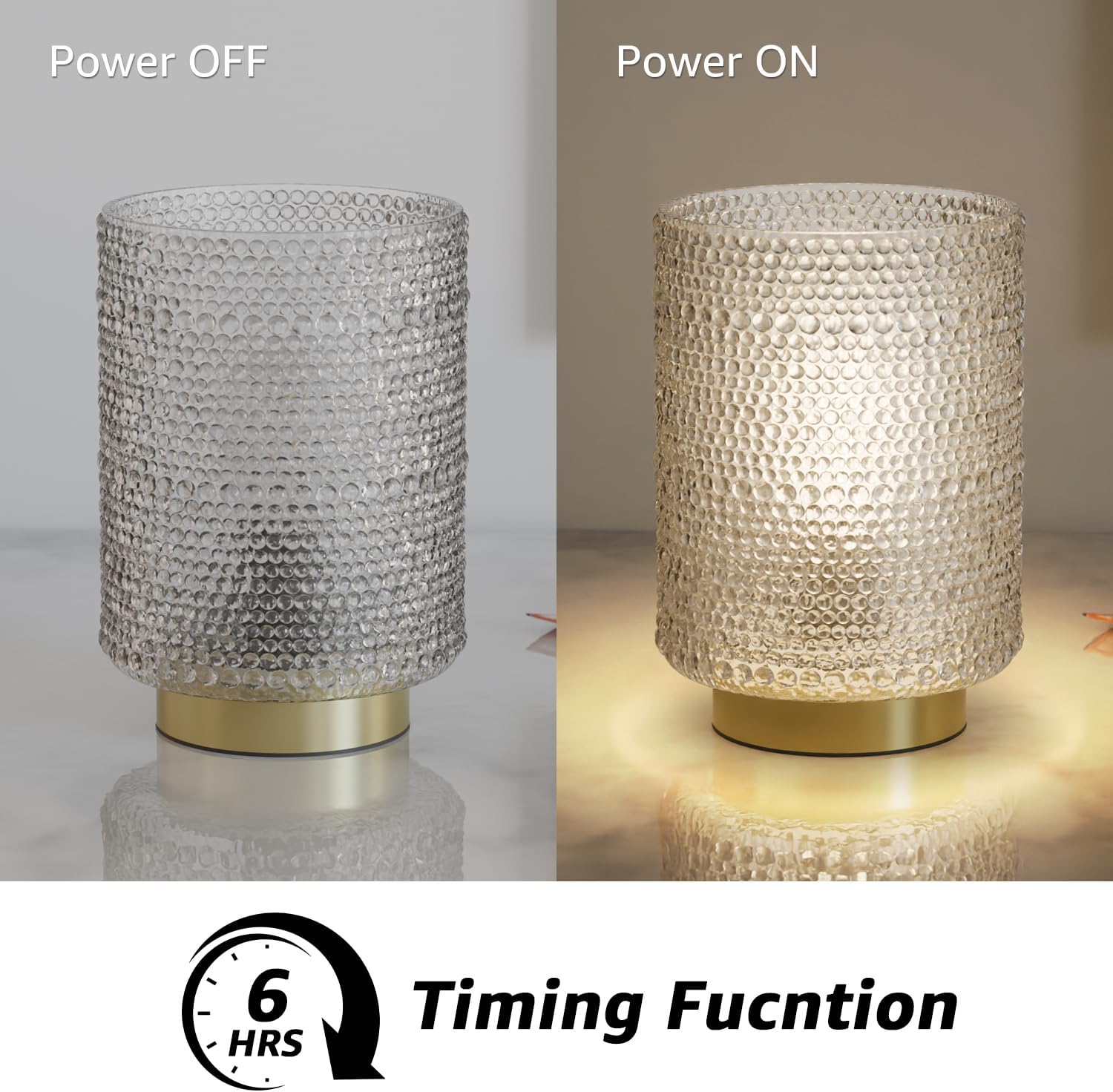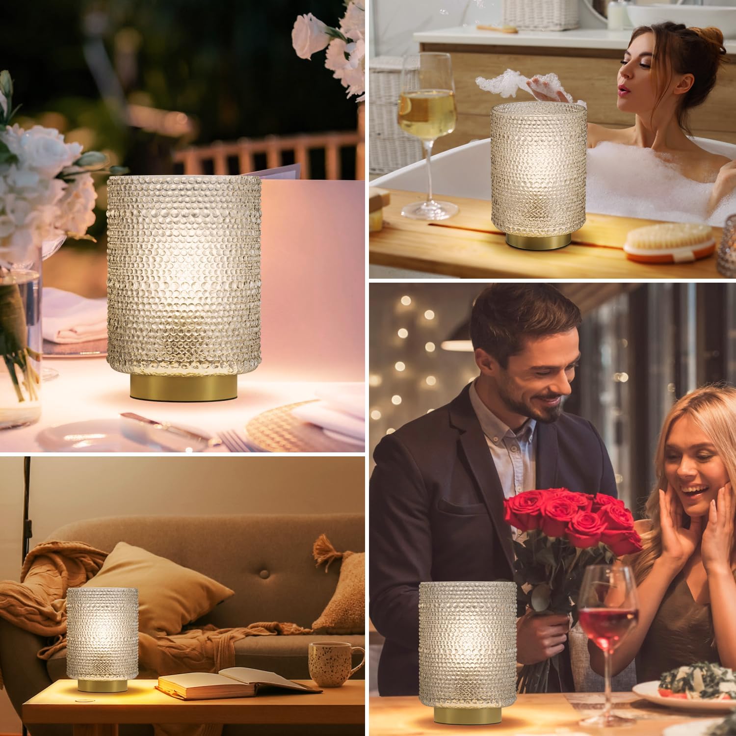The 2-PACK Glass Cordless Battery Operated Table Lamps (Clear) runs on 3 AAA batteries (not included), eliminating cord limits for use without outlets. It has a glass lampshade and metal base for modern elegance and durability, plus an auto 6h ON/18h OFF timer. A stylish decor piece on or off, it creates cozy ambiance for nightstands, dining tables, etc., and makes a great gift.