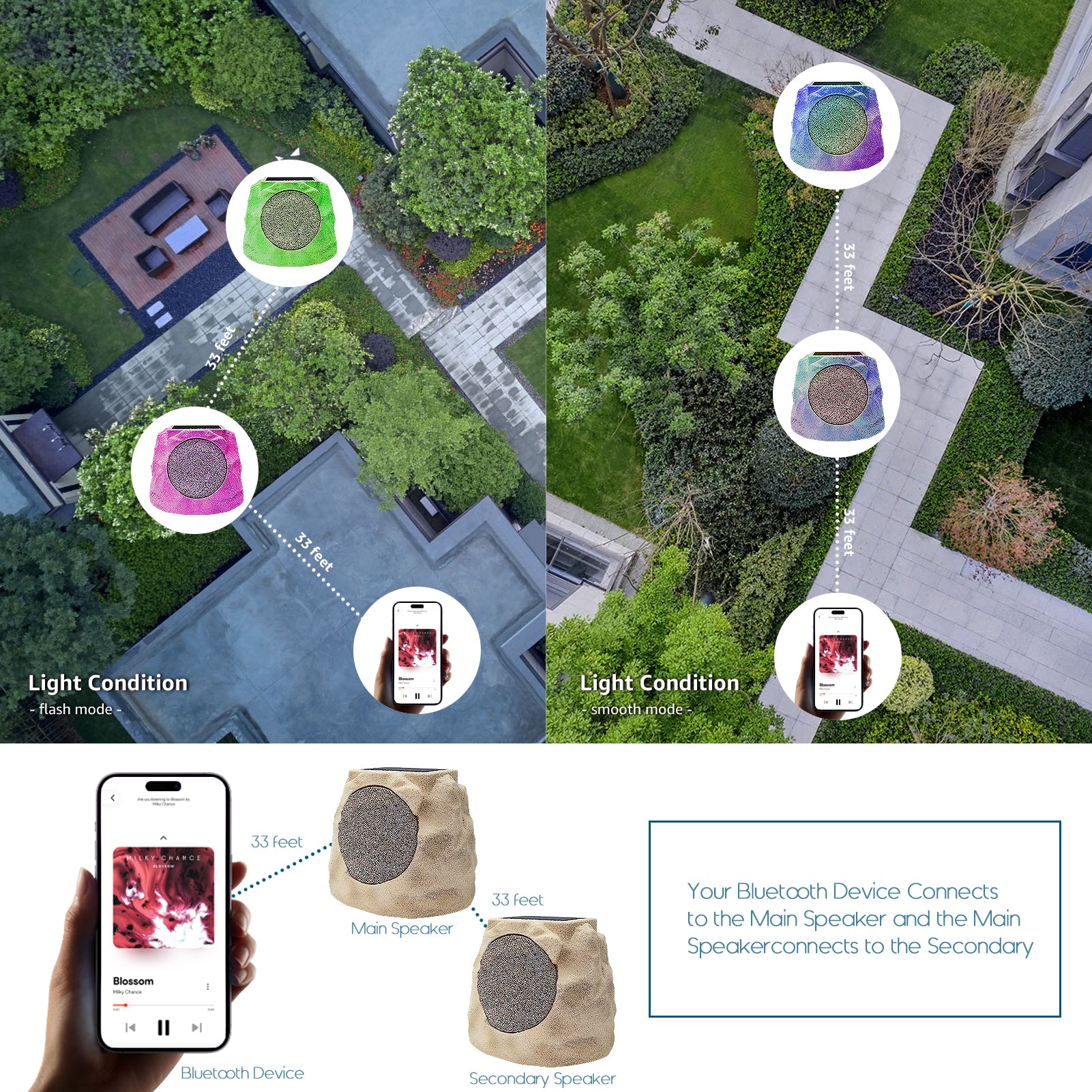 The Outdoor Solar LED Stone Speaker combines solar and USB dual charging—USB fully charges in just 4–5 hours. It features RGB LED lights that slowly change color in sync with music, plus a TWS pairing system enabling two speakers to connect within a 30FT range for richer sound. Boasting an IP44 waterproof rating, it withstands rain, snow and harsh sunlight, blending seamlessly into gardens, patios or backyards, while dual-signal stereo delivers immersive, lively audio. Product Dimensions: L23.5 x W19 x H18.5cm
