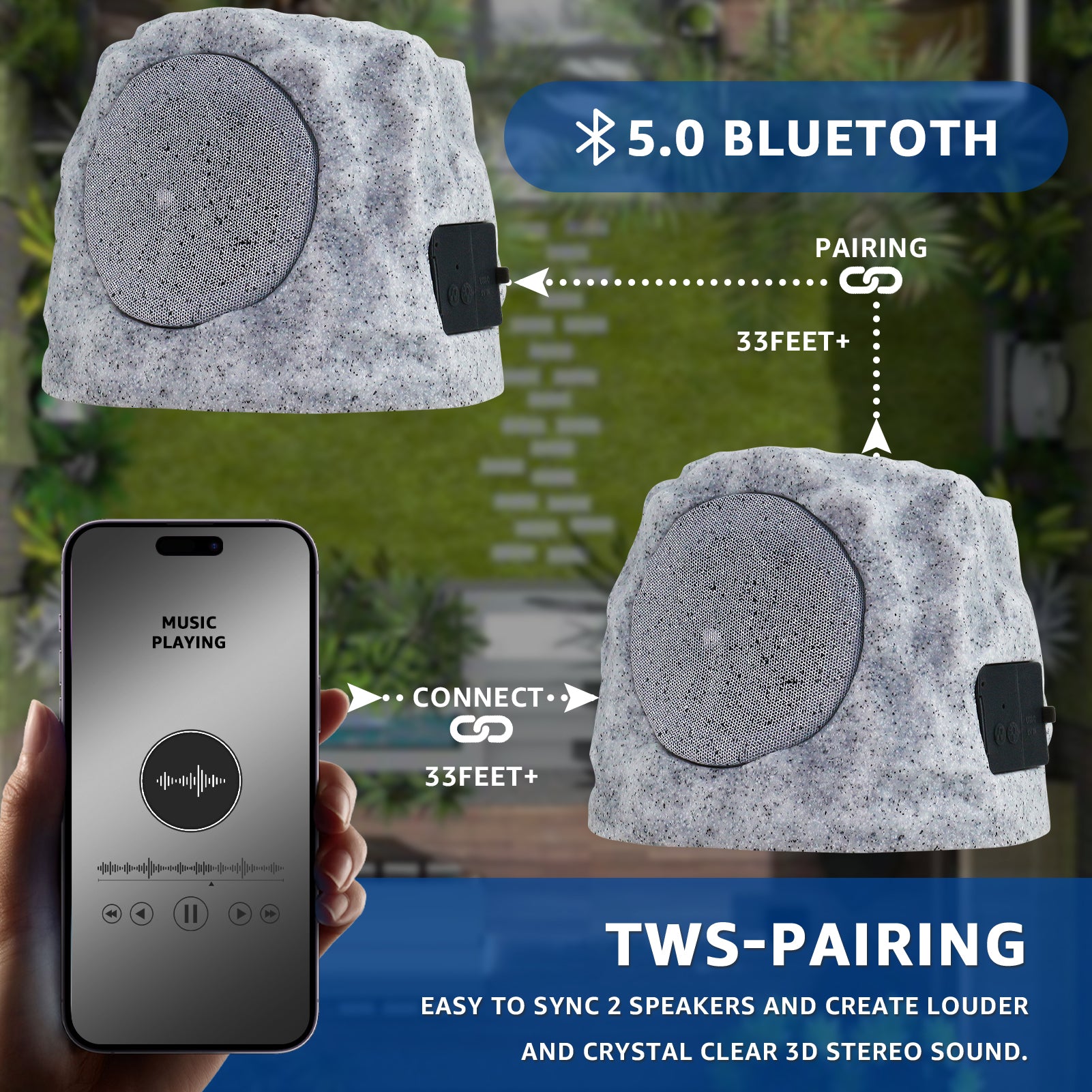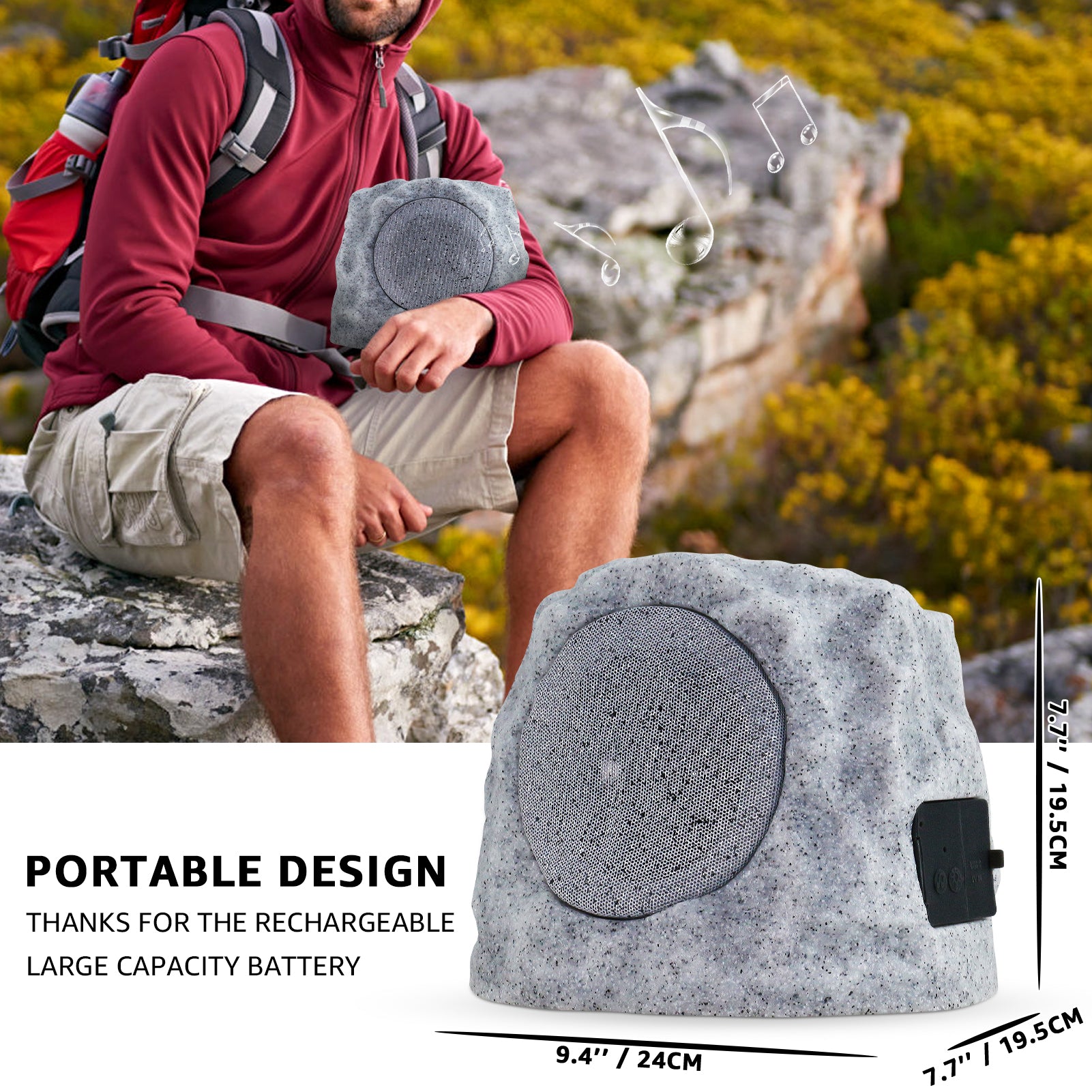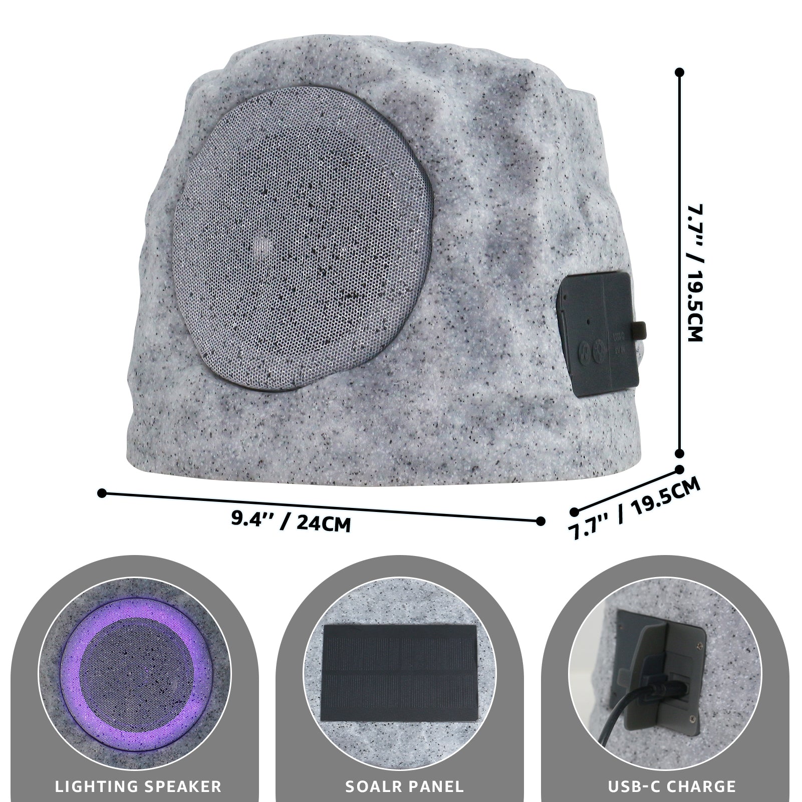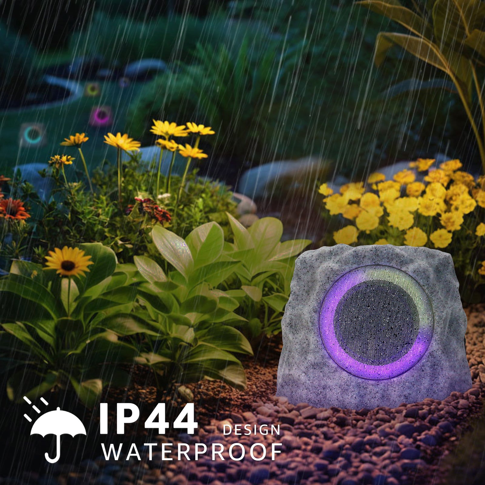 The 2-PACK Outdoor Solar RGB Flash Rock Speaker combines solar and USB dual charging—USB fully charges in just 4–5 hours. It features RGB LED lights that slowly change color in sync with music, plus a TWS pairing system enabling two speakers to connect within a 30FT range for richer sound. Boasting an IP44 waterproof rating, it withstands rain, snow and harsh sunlight, blending seamlessly into gardens, patios or backyards, while dual-signal stereo delivers immersive, lively audio.