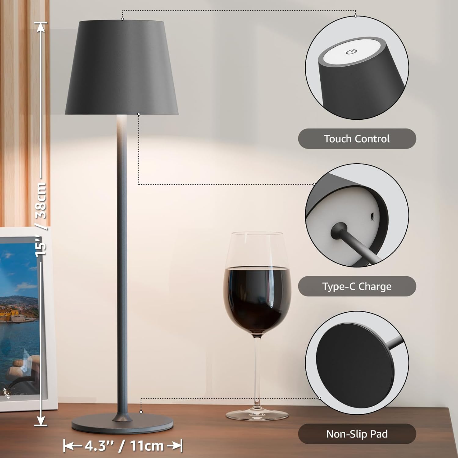 The Outdoor&Indoor USB Rechargeable LED Touch Table Lamp brings modern style and flexibility to any space. It's a sleek and versatile lighting solution, ideal for those corners without nearby plug sockets, with an integrated LED offering warm to cool light and a stepless touch dimmer for perfect ambience. IP54-rated for dust and splash resistance, itβs ideal for indoor and outdoor use.Product Dimensions: H11xDia38 cm
