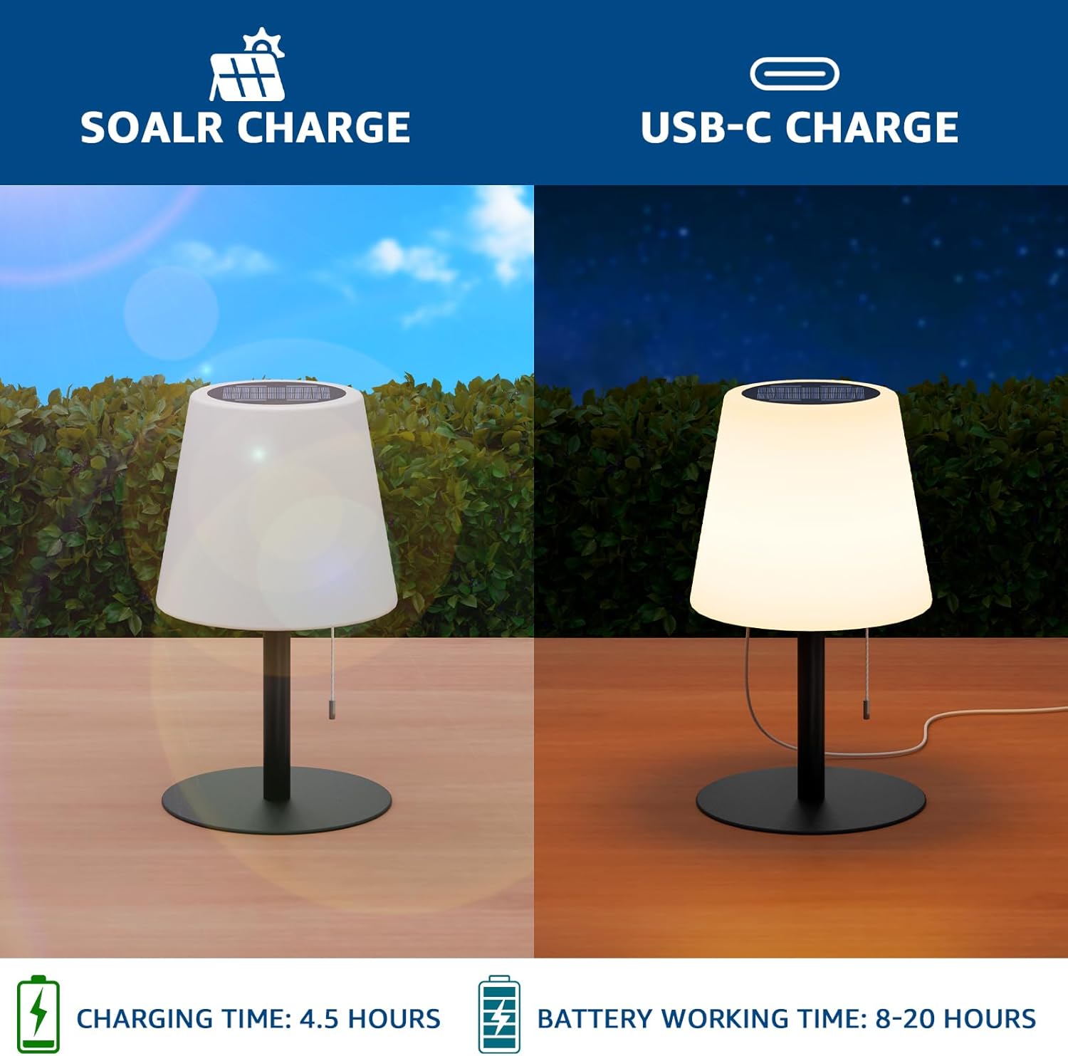 The 2-in-1 Outdoor Rechargeable Solar and USB Table Lamp is controlled by a cord switch, offers 7 colors and 2 warm white brightness levels for customized ambiance. It supports solar and Type-C dual charging, lasting 5–20 hours fully charged. Made of compressed PE lampshade and high-temperature treated metal parts with IP44 protection, it’s sturdy for indoor-outdoor use—terraces, bedrooms, camping, etc.—and ideal as a practical, eco-friendly gift.