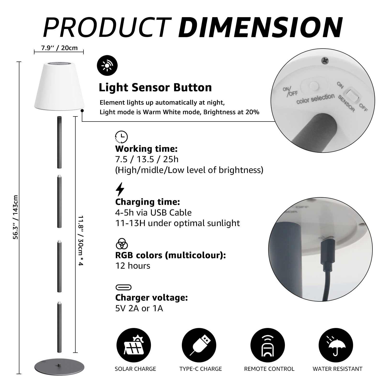 The Outdoor Solar LED Floor Lamp with Remote control for garden, patio brings modern style and flexibility to any space, especially for your deck or patio. It illuminates with a soft glow and easy use with its solar panel. It elevates your outdoor space into one that is welcoming, a place to entertain or enjoy in solitude. It works with an integrated LED offering warm light and multi-colors changing lights for perfect ambience. IP44-rated for dust and splash resistance, it’s ideal for indoor and outdoor use. Product Dimensions: H24xDia152cm